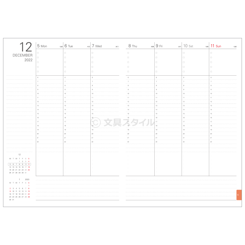 1週間の予定を時間で管理できるので、計画的なスケジュールが立てやすいバーチカル式です。