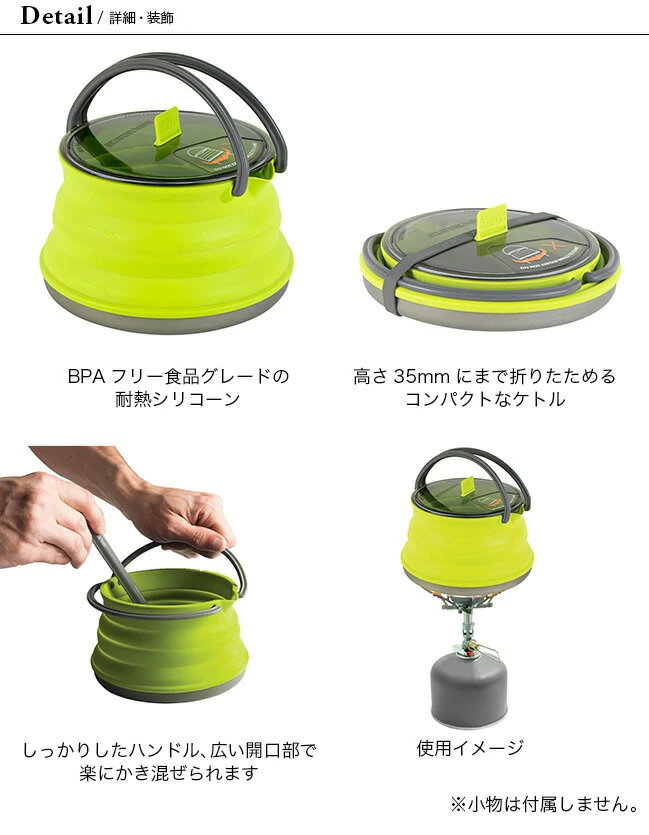【 SPEC /製品仕様 】■ブランド名:SEA TO SUMMIT ■商品名:X-ポット ケトル 1.3L ■商品型番:ST84014 ■カラー:ライム,サンド ■サイズ:折りたたみ時/高さ35mm ■素材:シリコン、アルミニウム ■重量:186g ■生産国:— ■仕様:ガラス補強されたナイロン66製ハンドルを2本備え、上部の縁をしっかり保ち、安定してお湯を注ぐことができます。